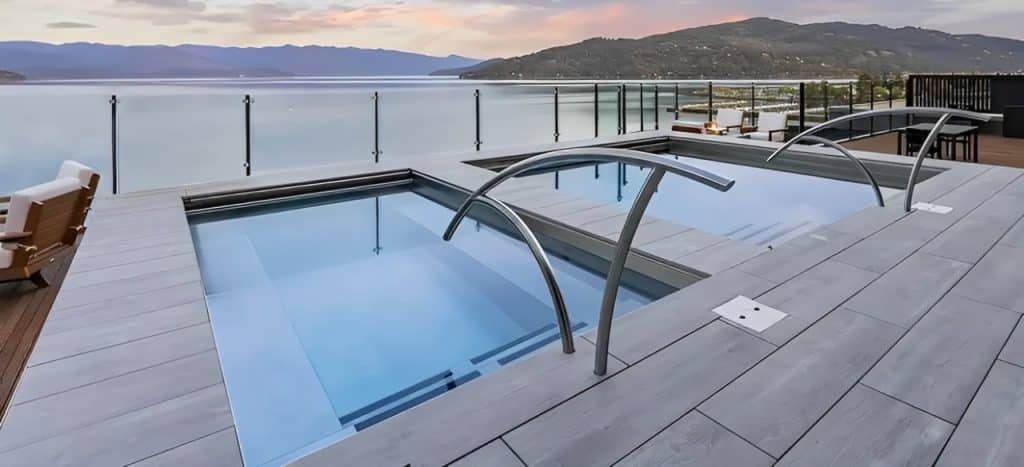A stainless steel pool with swim spa system, integrated spa seating, LED lighting, and automatic cover for year-round use.