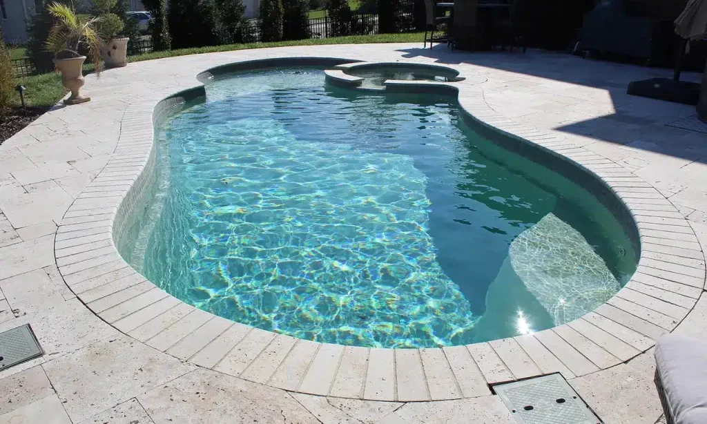 Elegant curved pool with built-in spa, offering soothing spillover, generous swim space, and luxurious backyard relaxation.