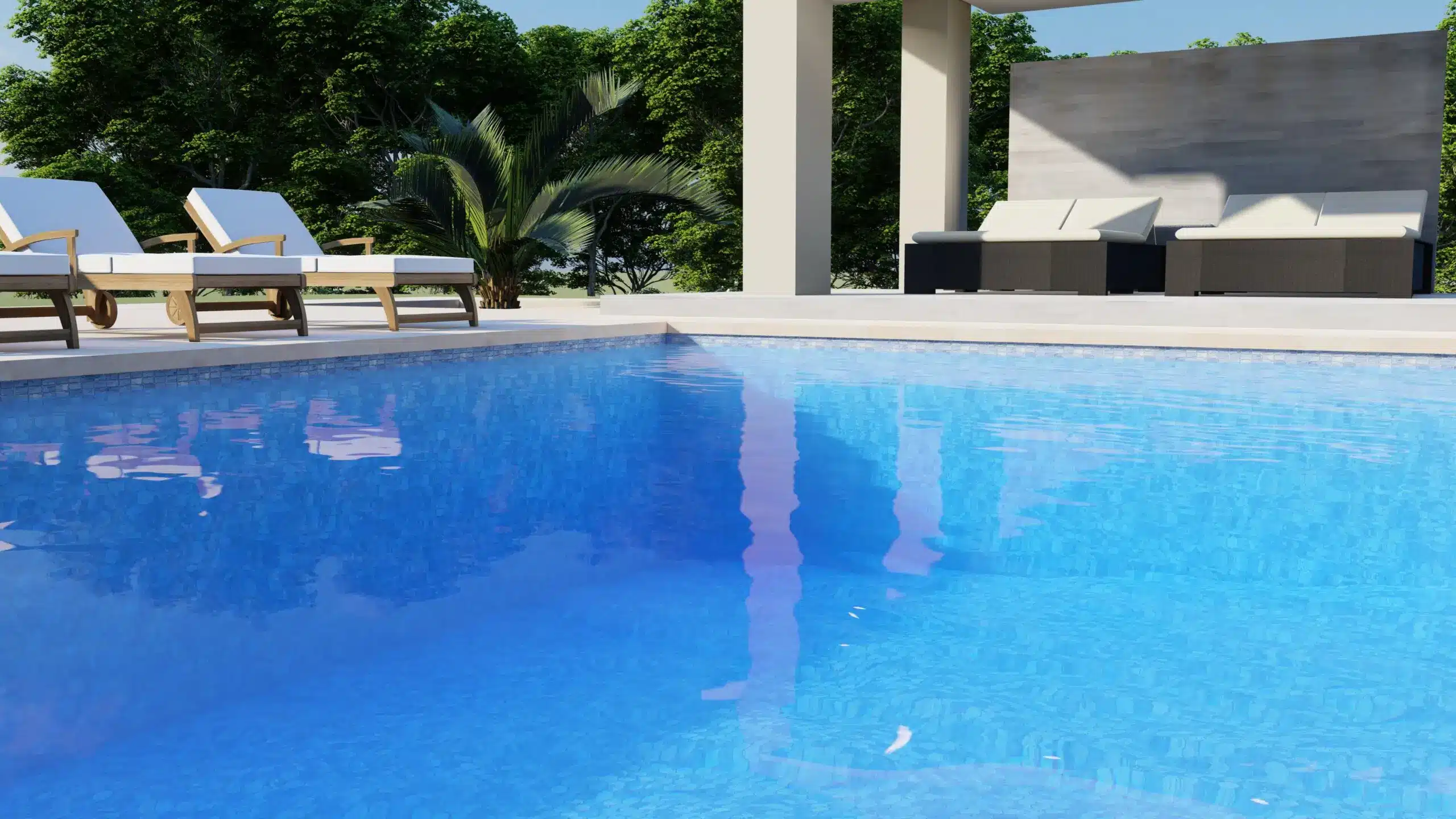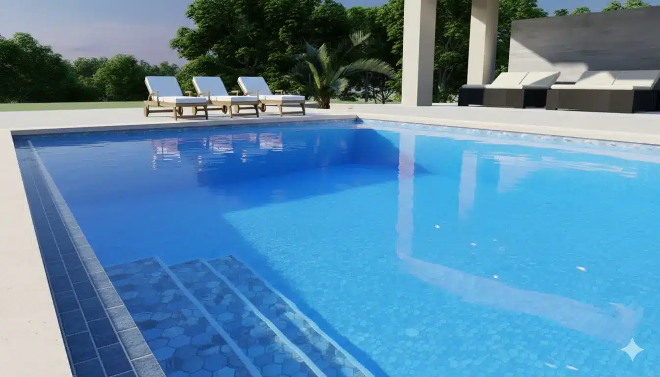 The Belmont Tile / Beachside pattern offers a sophisticated, spa-like aesthetic for your swimming pool. The border features a classic “Belmont Tile” design with stacked rectangular blue tiles that create a clean, elegant frame at the waterline. Below the waterline, the “Beachside” floor pattern showcases a trendy hexagonal stone mosaic. This design blends shades of blue, slate grey, and warm tan to create a textured, natural look that makes your pool water appear crystal clear and inviting.
