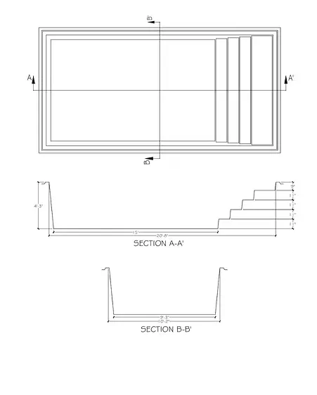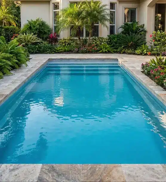 Wide, stadium-style steps span the pool’s width, allowing easy access and creating a comfortable seating area for multiple guests. - Full Flat-Bottom Floor: