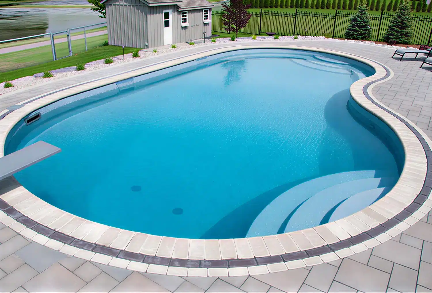 A gracefully curved pool design offering elegance, comfort, and customizable luxury features for a refined backyard retreat.