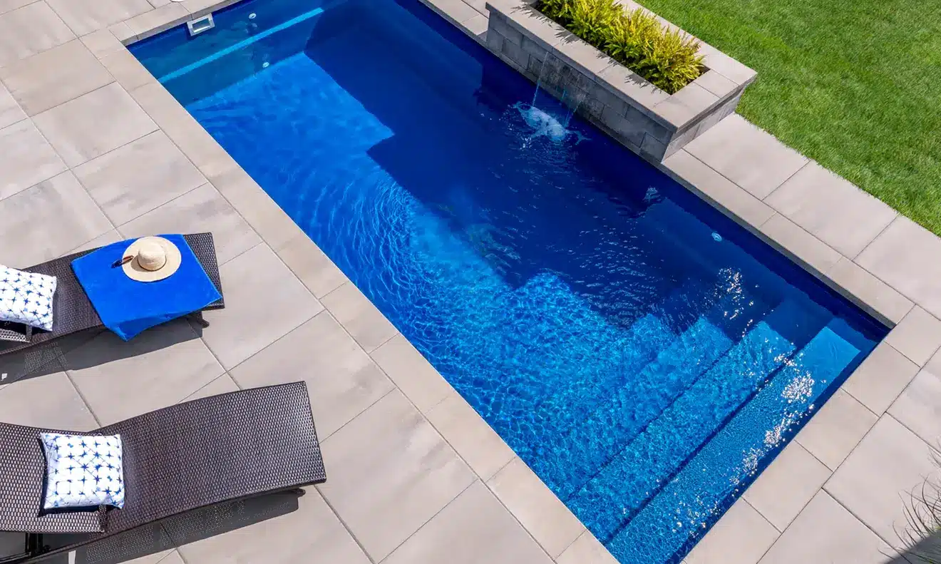 A slimline, space-saving pool with side-entry steps and extended bench seating ideal for compact and modern outdoor spaces.