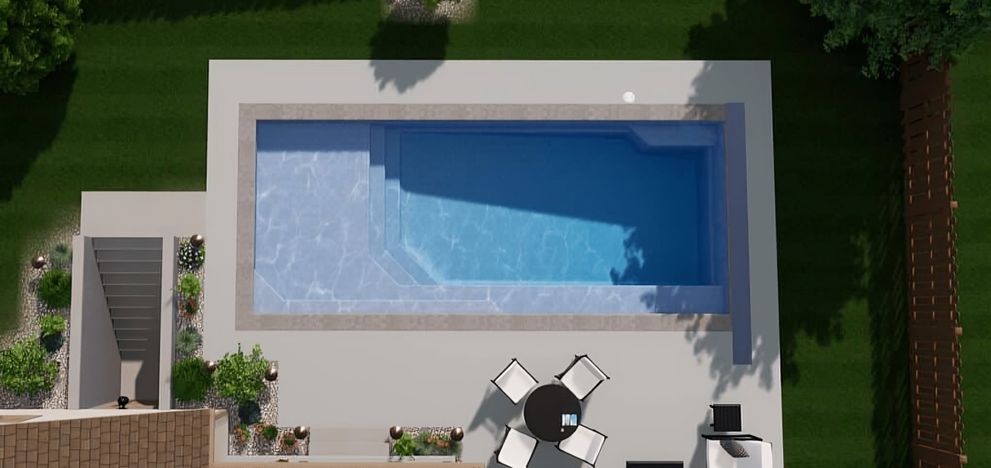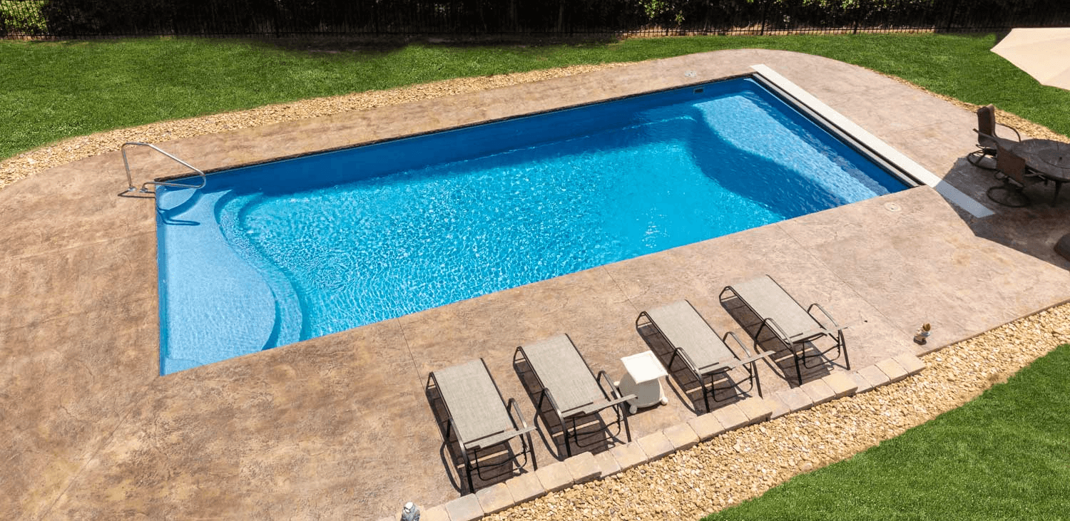 Experience the Barcelona, a rectangular fiberglass pool with clean lines, curved entry stairs, and versatile spaces for swimming, relaxation, and family fun in your backyard.