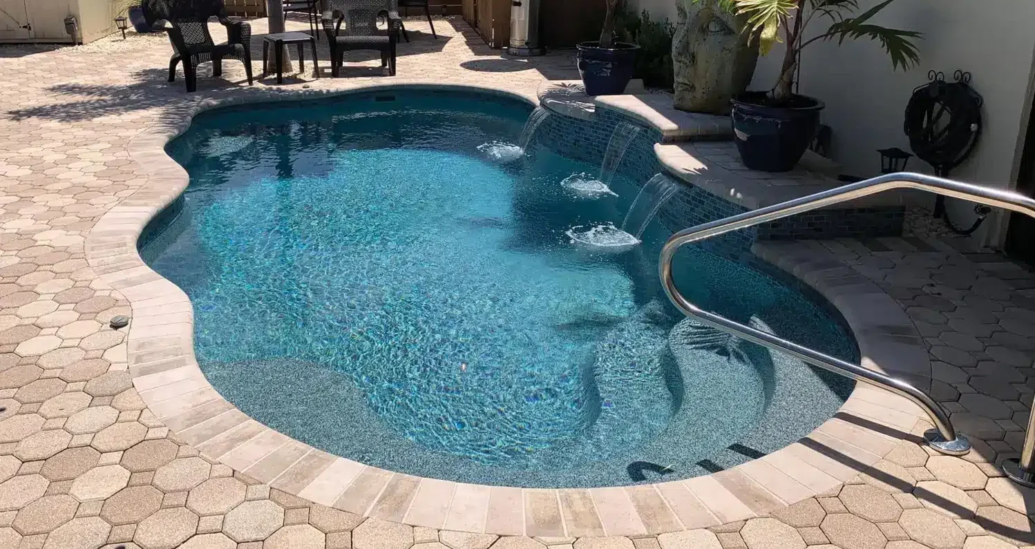 The Coral 16 is a modern freeform fiberglass pool with a spacious tanning ledge and versatile swimming areas perfect for family fun, relaxation, and stylish backyard entertaining.