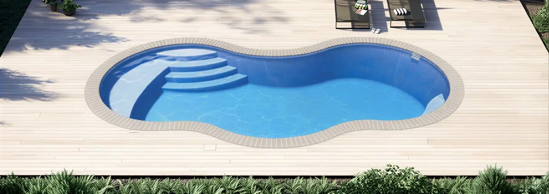 The Coronado is a spacious fiberglass pool with curved entry steps and a wide swimming area perfect for creating unforgettable family fun and offering endless relaxation.