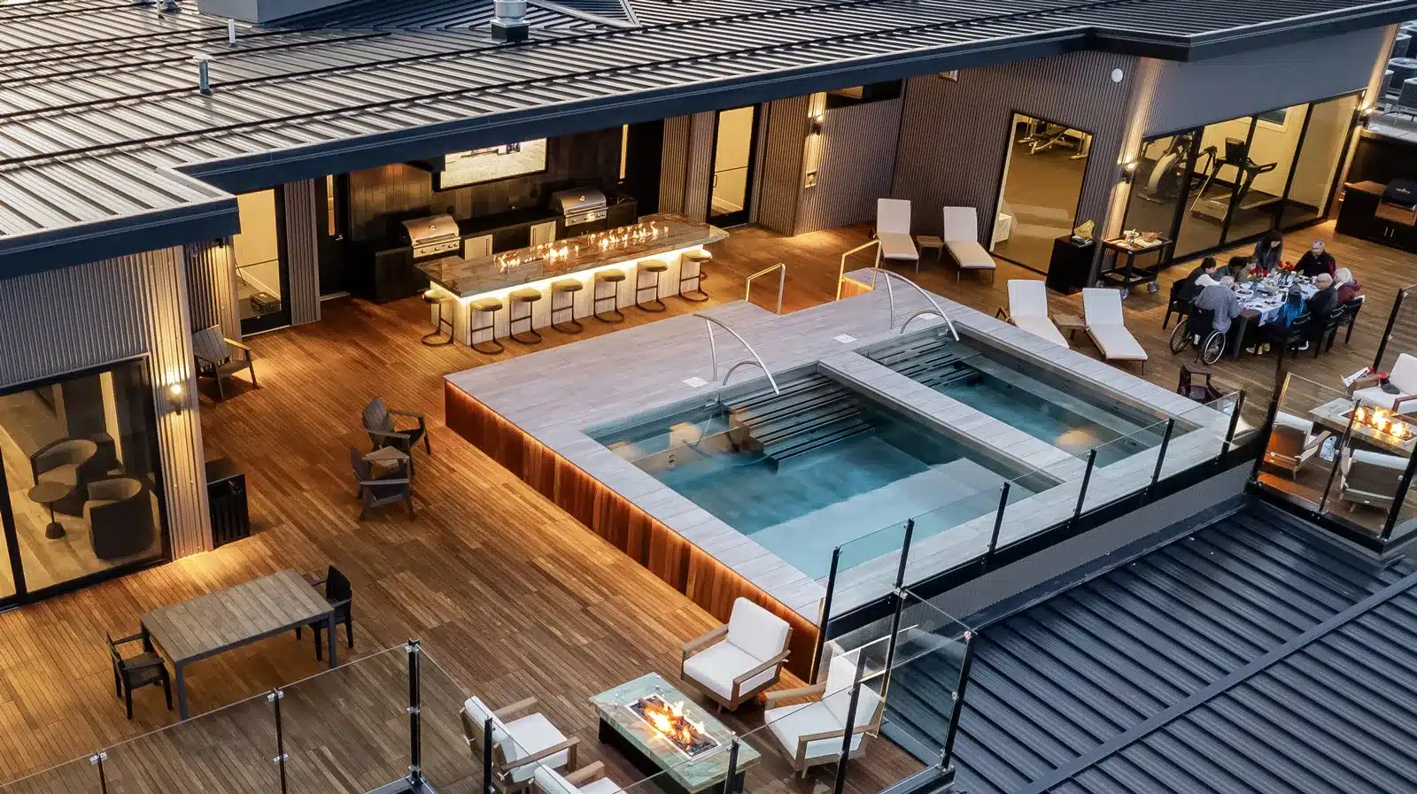 Combines swimming and relaxation zones within one cohesive rooftop layout.