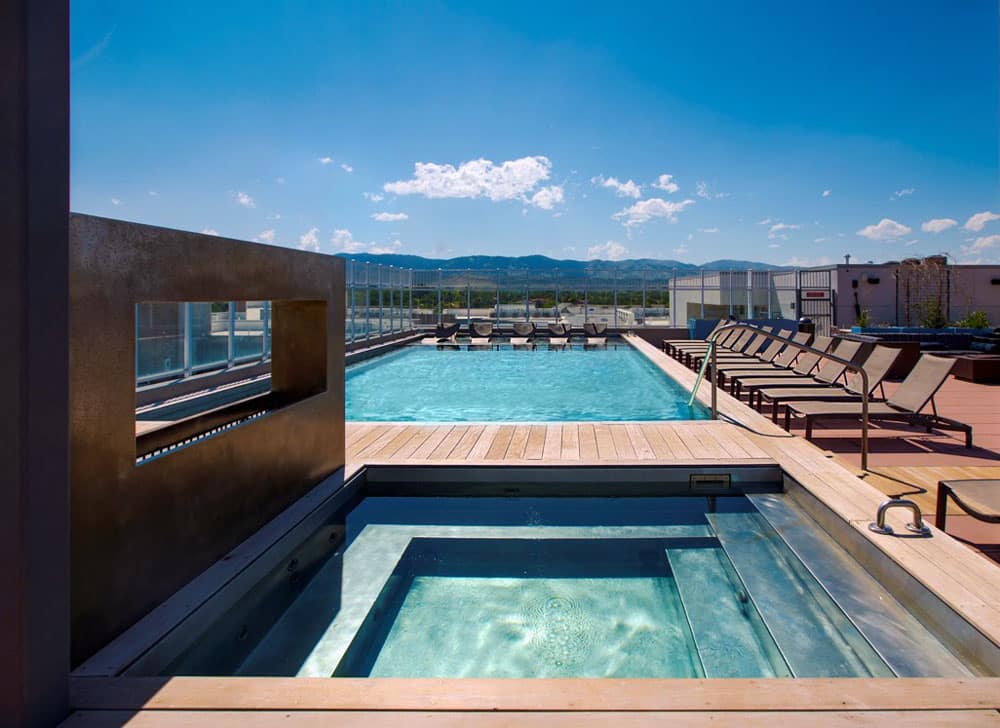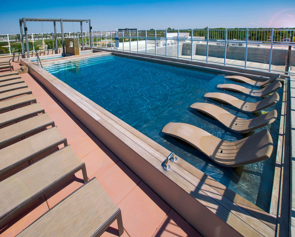 This custom stainless steel pool is designed for high-end residential and commercial spaces, delivering a refined balance of luxury, durability, and modern design. Featuring a built-in sun shelf, descending stairway, and integrated bench seating, the pool provides comfortable lounging and effortless access while maintaining a sleek architectural profile.