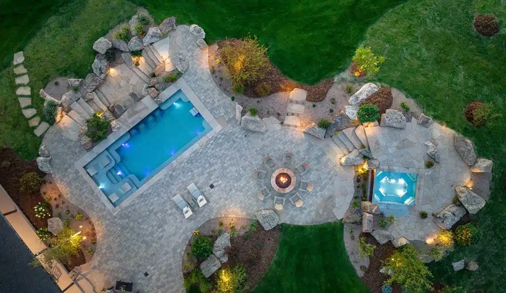 The pool also incorporates an integrated swim spa and laminar jet water features, creating a balanced blend of wellness and visual elegance. An automatic pool cover improves safety, heat retention, and energy efficiency, making this pool as functional as it is visually striking. This design is perfectly suited for upscale residential settings and high-end lifestyle environments.