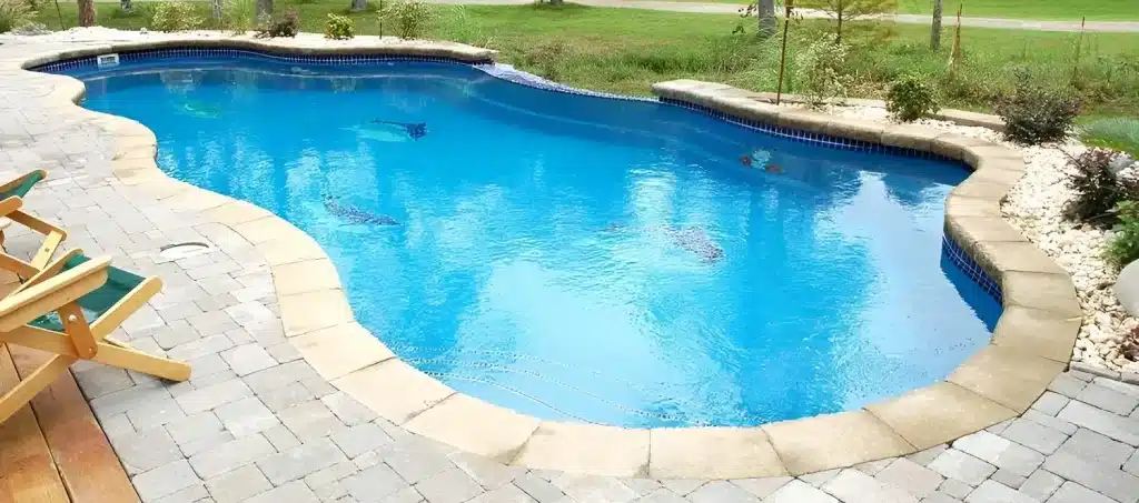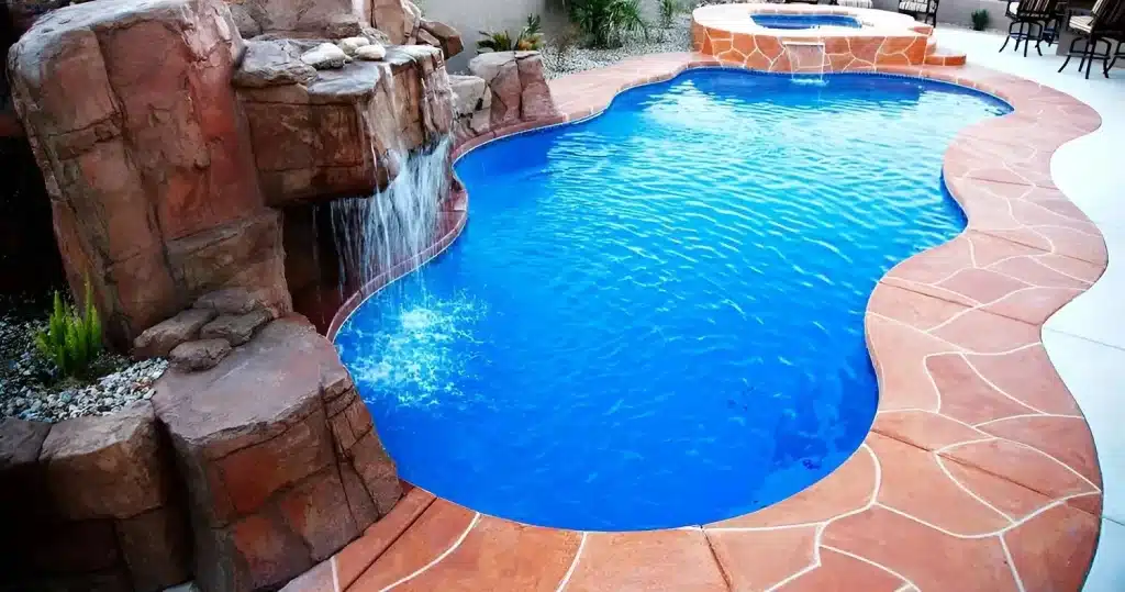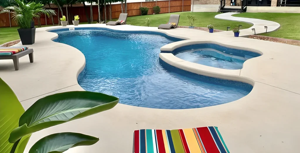 The Jamaica 14 is a graceful freeform pool with soft angles and curves, designed for family fun, relaxation, and creating a backyard paradise.