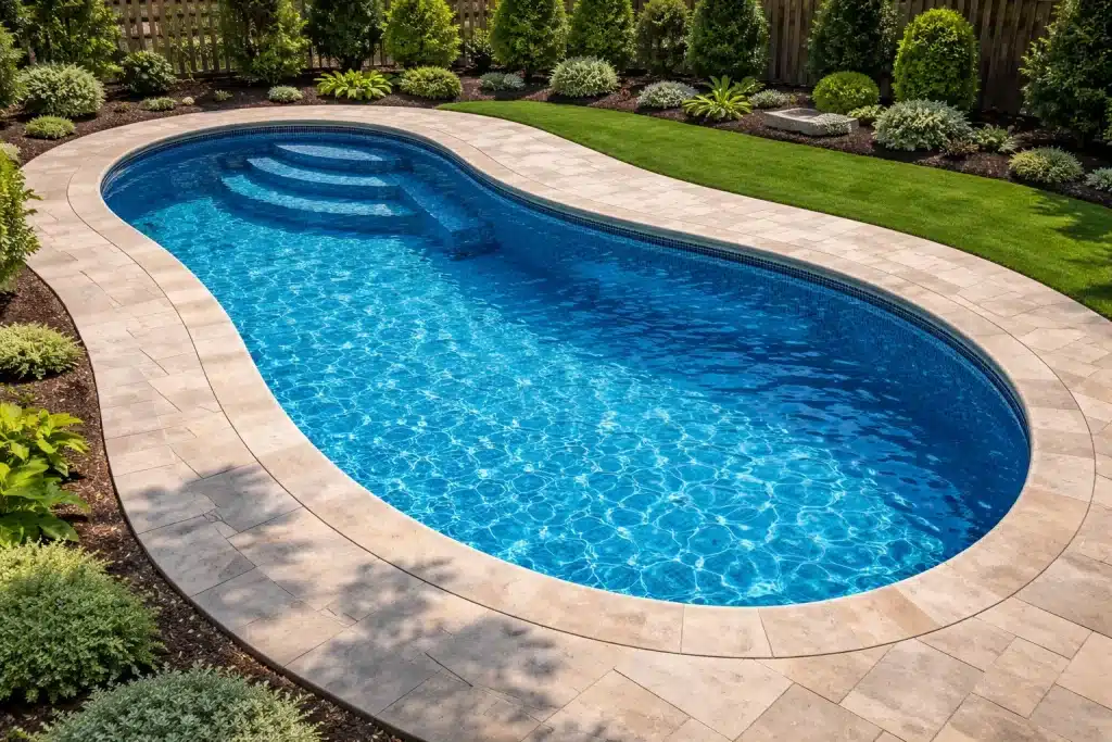 The Cancun is a stunning freeform pool featuring layered curves, wraparound entry steps, and built-in seating designed for relaxation, play, and entertaining.