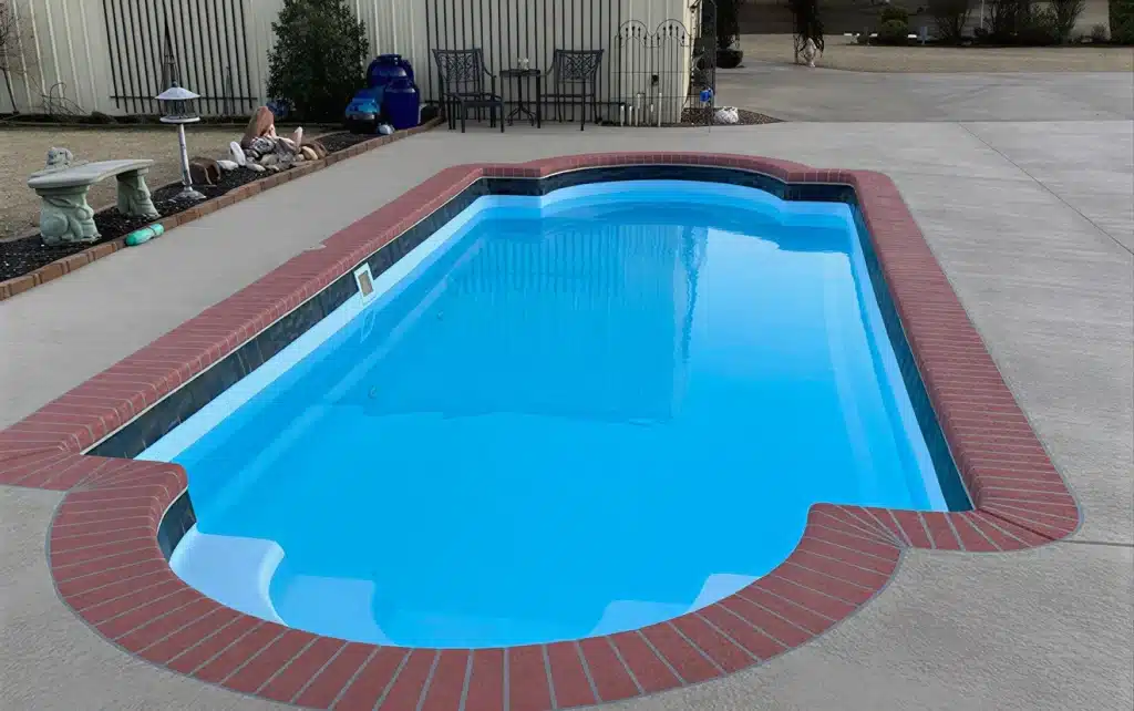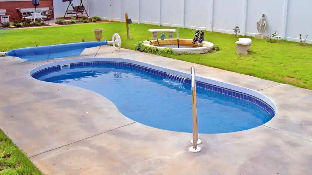 The Shoreline is a traditional kidney-shaped fiberglass pool that combines timeless design with practical features for families and backyard enjoyment.