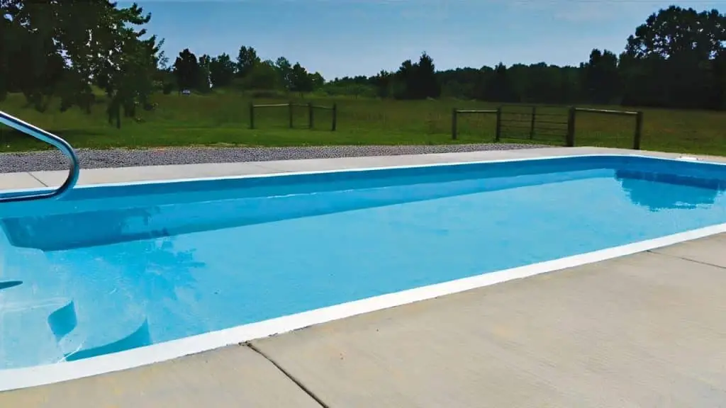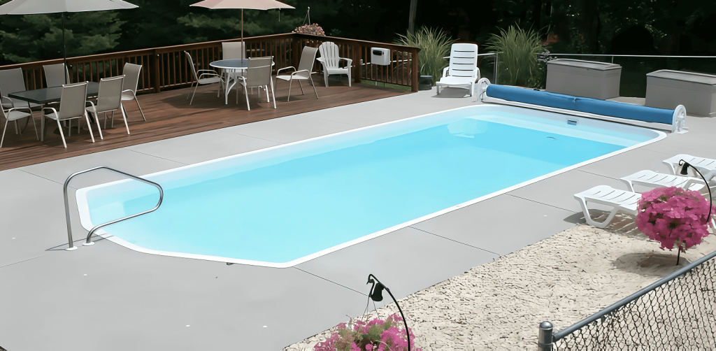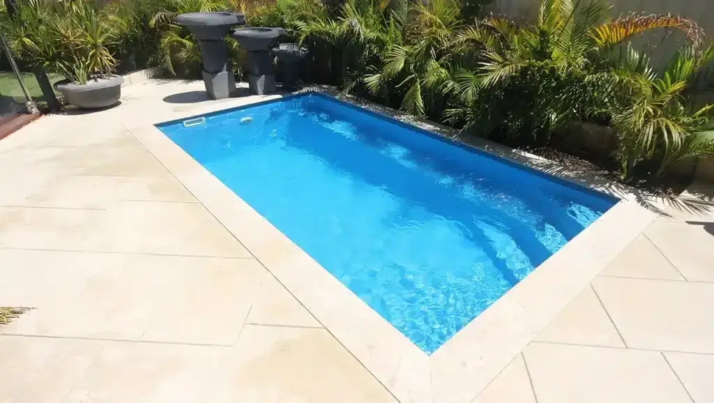 A smart, space-saving fiberglass pool with a slim-line geometric design, generous swimming area, and side-entry steps perfect for small or narrow backyards.