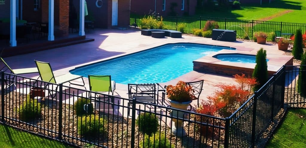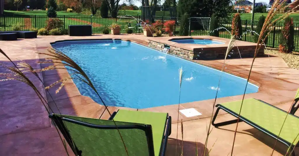 The Dominican with Spa is a freeform fiberglass pool featuring a built-in spa, offering the perfect mix of relaxation, style, and family-friendly enjoyment.