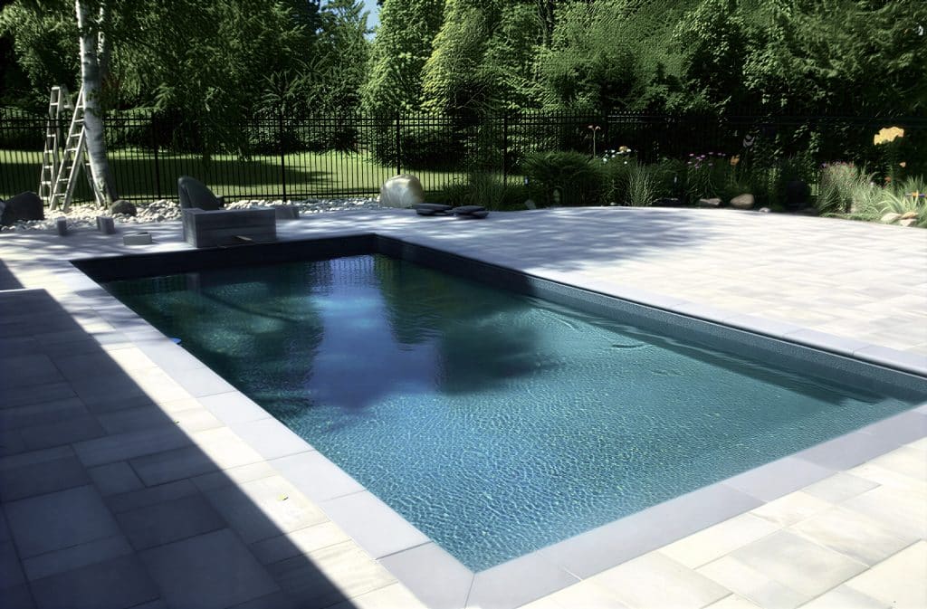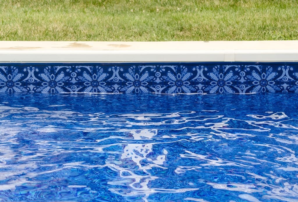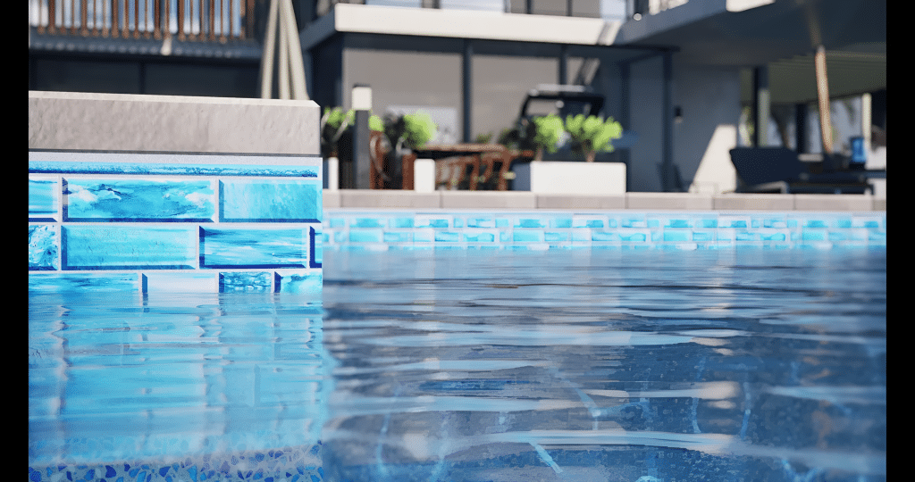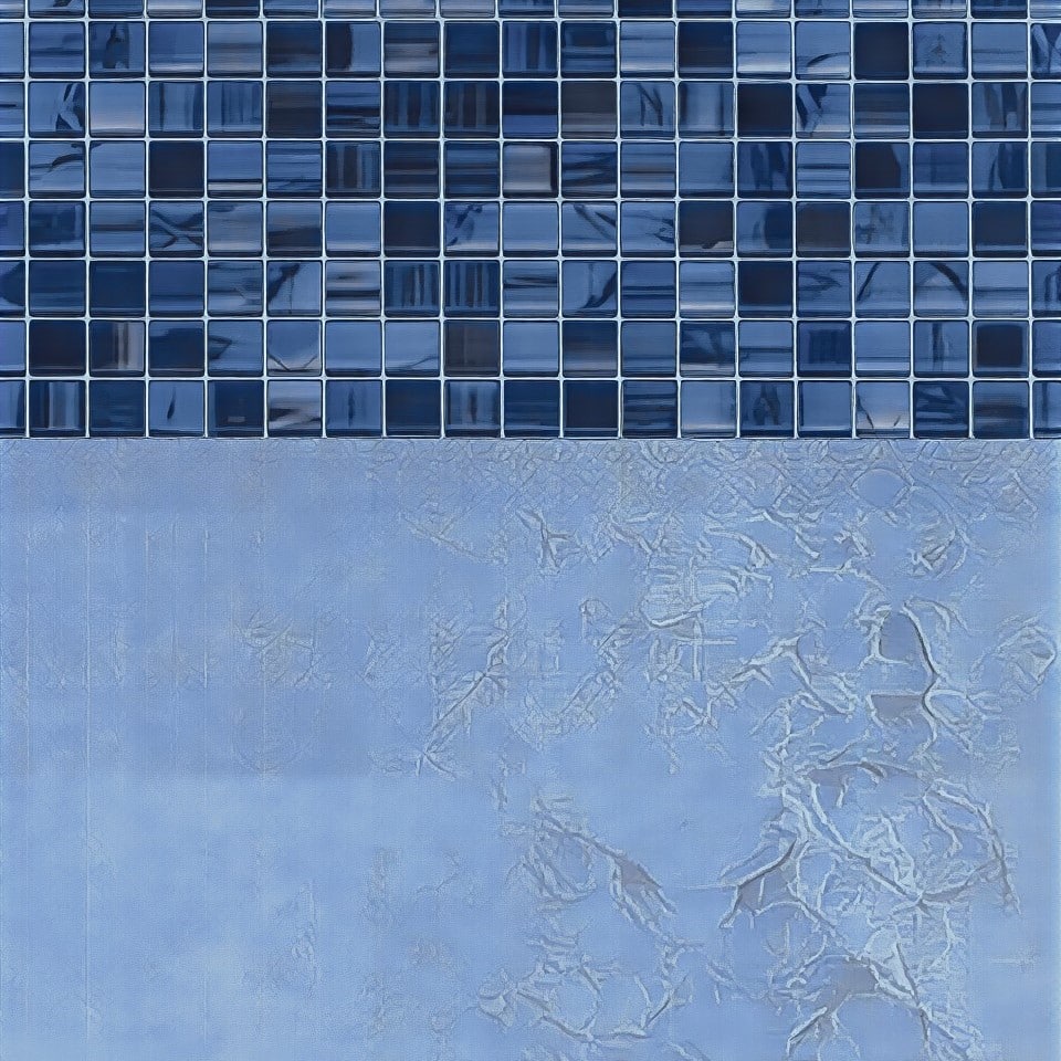 Island Tile-Summer Blue features a classic border of small, multi-tonal blue mosaic tiles that provide a clean, architectural edge. This