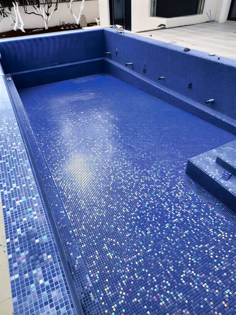 This is a vibrant blue mosaic pattern featuring a grid of small, square glass tiles. The mix of navy, azure,