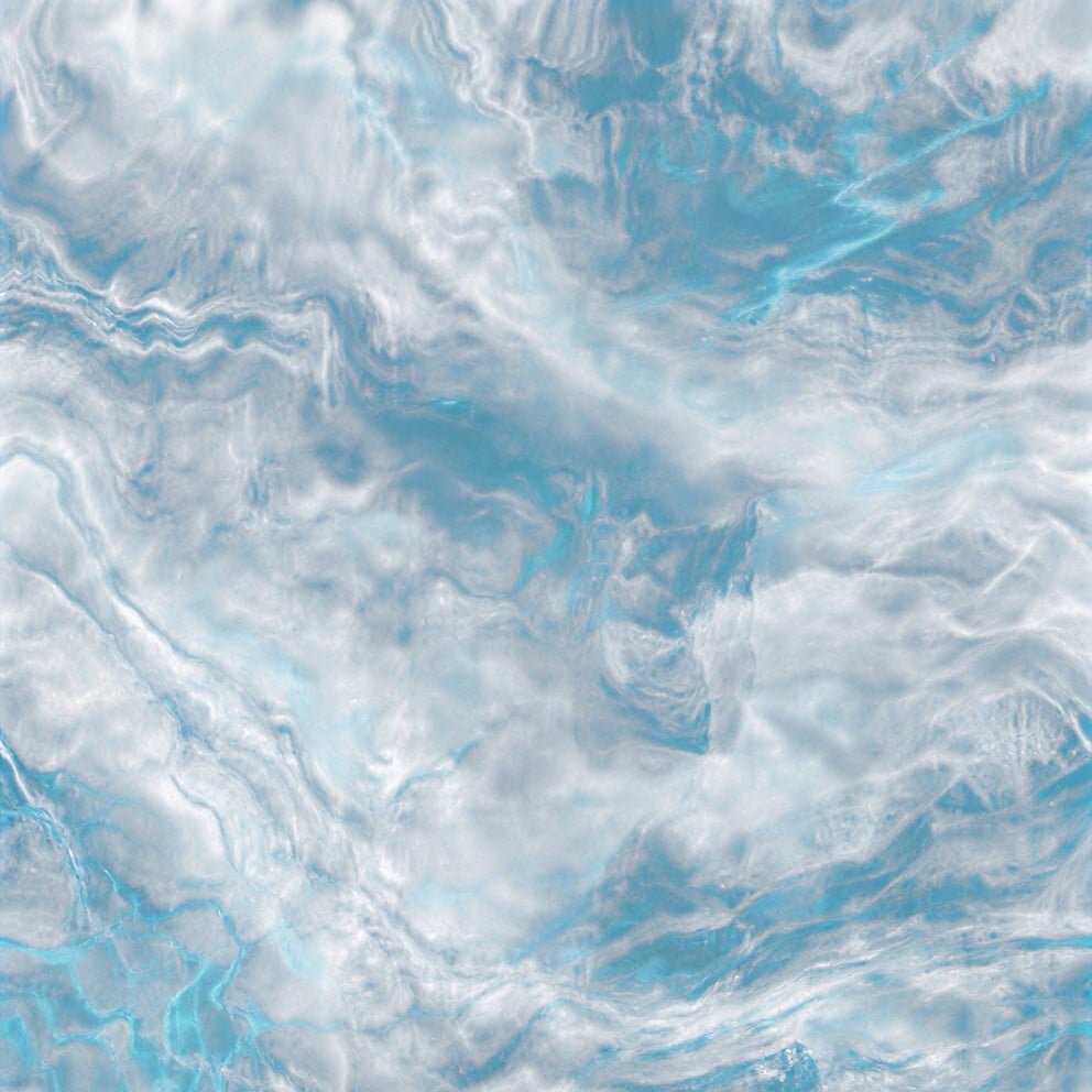 Seafoam is a fluid, ethereal pattern featuring swirling marble-like veins of soft white, silver-grey, and luminous turquoise. Its rhythmic, wave-like