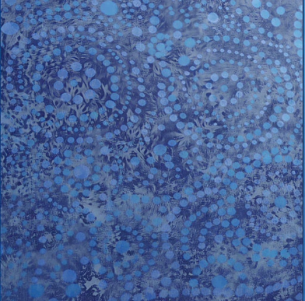 The Starlight Swirl is an all-over celestial pattern featuring swirling, pointillist dots in vibrant blue tones. Its abstract, galaxy-like design